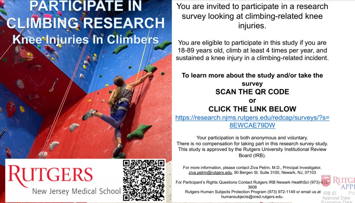 Researchers at Rutgers New Jersey Medical School want you to help them understand climbers’ experiences with knee injuries. Some friends of mine, Connie and Kai Lightner reached out to me to help support this and I’d love to help. Please consider checking out the survey if you meet the criteria in the post. Cheers!