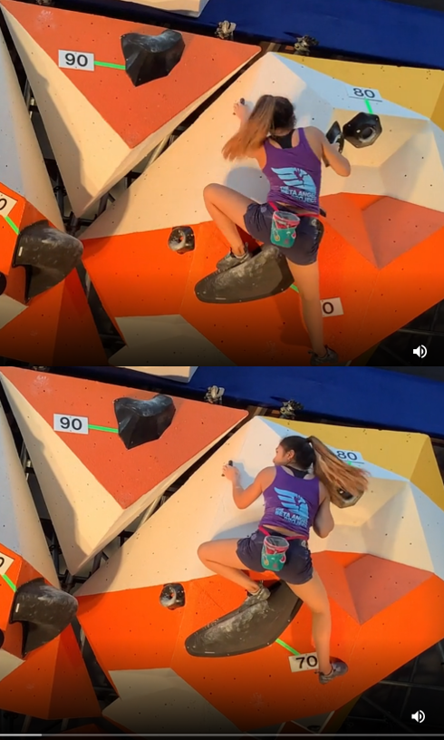 Finally, as I coached her, I generally helped her to learn how to “explore” her own body’s ability to position within the “constraints of the problem.” This required her to understand how to execute exploratory movement (in practice) and mitigate it (in performance) – a key component of climbing – all within the context of the properties of the holds and their placement on various wall angles.[13] Finding affordances, or opportunities for action, with a perch often involved her identification of a foot with the movement necessary to “fit” the skill — all so she can see the opportunities when they present themselves during performance.
