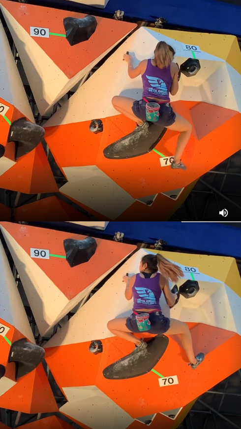 In Figure 4, we see Arabella start to act on the new information – called performatory movement, in order to distinguish it from the aforementioned ‘exploratory movement.’ She brings her right foot up, then she begins to push out from it which brings her to her “high-CoG” position. From this location, with a bend in the knee (increasing “push”) and a (relatively) stable foot (than the previously used wall surface), she now has a better sense that a deadpoint will allow her to hit the distance for the “90” hold — and then some: due to the 90’s direction of grab, she has to overshoot it slightly in order to avoid sliding back toward her right hand. This was all previously learned movement once she identified the opportunity, but she needed two things to make that identification work.