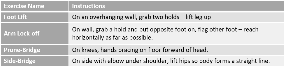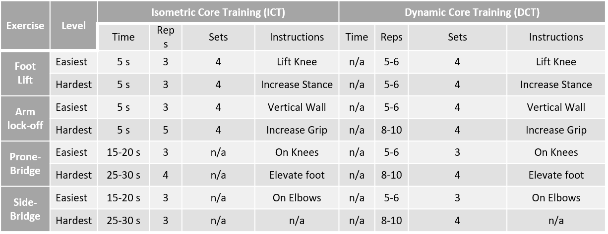 Context: The study (2018) included 13 males and 6 females who climbed between 5.11c anad 5.13c and were divided up into two groups, with one training isometric core and the other dynamic core. The researchers wanted to test whether isometric core training (ICT) or dynamic core training (DCT) was more effective in both advanced and elite climbers. Tests included: climbing-specific core (body lock-off; body lift) and non-climbing specific core (dynamic: superman; isometric: trunk flexion; trunk rotation right; trunk rotation left)