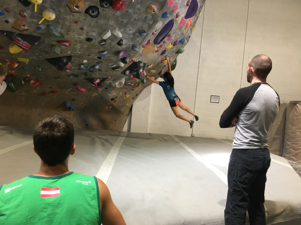 - Campus Board Exercise (combined on Bouldering Days): First exercise à Ten sets (5 per starting hand) of 1-4-7. Second exercise à Called the “pull up ABC” which appears to be 5 sets of lock-offs until failure. Each lock-off appeared to consist of (1) pull-up and (2) lock-off (bend- at the elbow) at 120°, then a second pull up and lock at 90°, and a third at 60°. Each lock lasted 7 seconds. Not mentioned: Length of rest between hands and exercises.