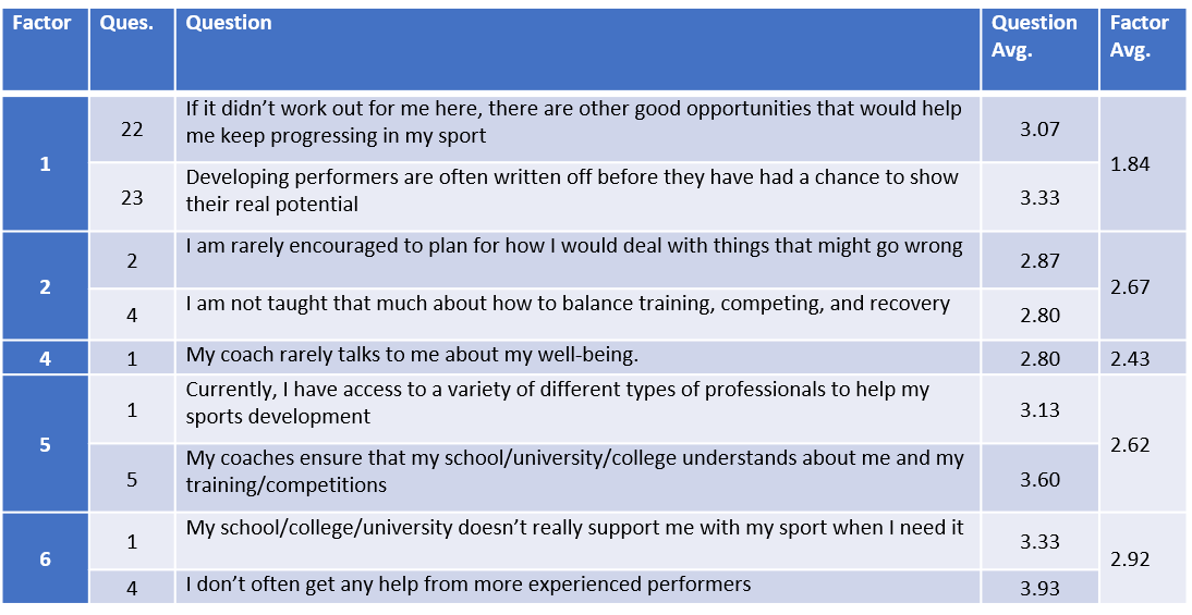 With Factor 6, I also took a look at question 2, since it was weighted higher: the athlete is regularly told that winning and losing in the present doesn’t indicate future success. This is an area that seems simple to implement, but I’m not entirely clear on effective approaches for ensuring the athlete internalizes the point.