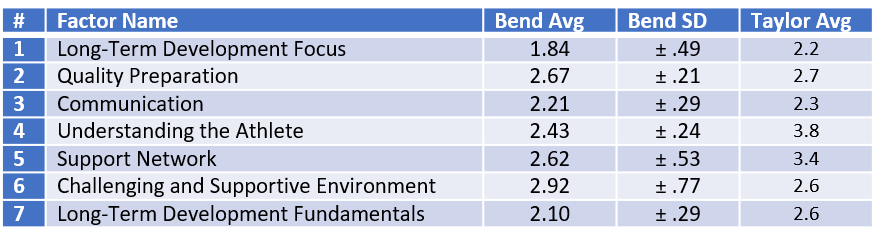 The values I provided are only from two athletes: as a form of overly-simplistic comparison. My athletes all have multiple coaches and are on teams I am not affiliated with. As a result, I can’t use these numbers to rate my “program” since this survey stresses the overall environment – I’m just one factor (no pun intended) in their response. It’s a bad idea to compare my numbers with his, but absent a better option I’m doing it anyways. This should hopefully encourage you and your team to not only consider using the survey but also (not contingent upon the survey, which is open source and compliments of R.J.J. Martindale et al.) providing anonymous, aggregated data. You will not see any of Bend’s individual scores on here. 🙂