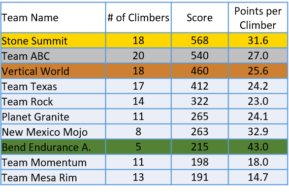 Mike Rougeux’s team, the Bend Endurance Academy (BEA), punches hard for their numbers. At this year’s 2019 Bouldering Youth National Championships, the team took 8th place out of 88 teams with an extremely low 5 total climbers. The average numbers for the top ten teams was 13.5 climbers per team, with the next lowest team at 8 and the max at 20. In fact, if you look at points per team member, the numbers are a little eye opening. Mike’s team averaged 43 points per team member, compared to 31.6 points (Stone Summit), 27 points (Team ABC), and 25.6 points (Vertical World) for the top three teams. That’s not exactly a fair comparison, since the rules state that you only get points for your top competing member per youth category, so it would only be possible for a team to be scored based on 10 climbers.