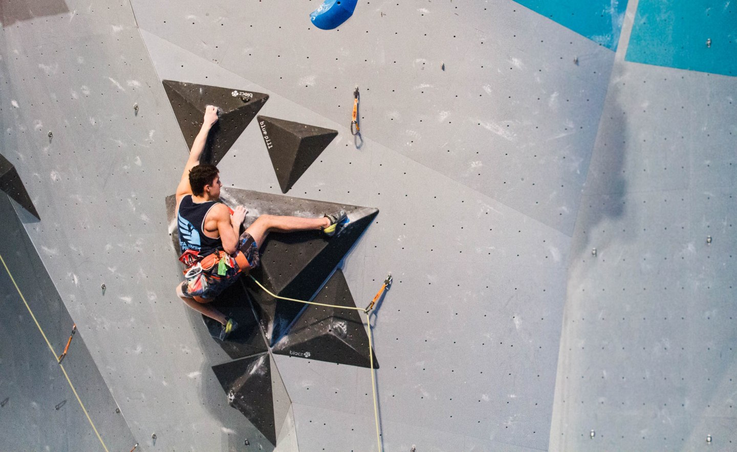 16 year old Charlie Osborne on his way to a 7th place finish at his first adult Sport Climbing Nationals. Image courtesy of Jennie Jariel.