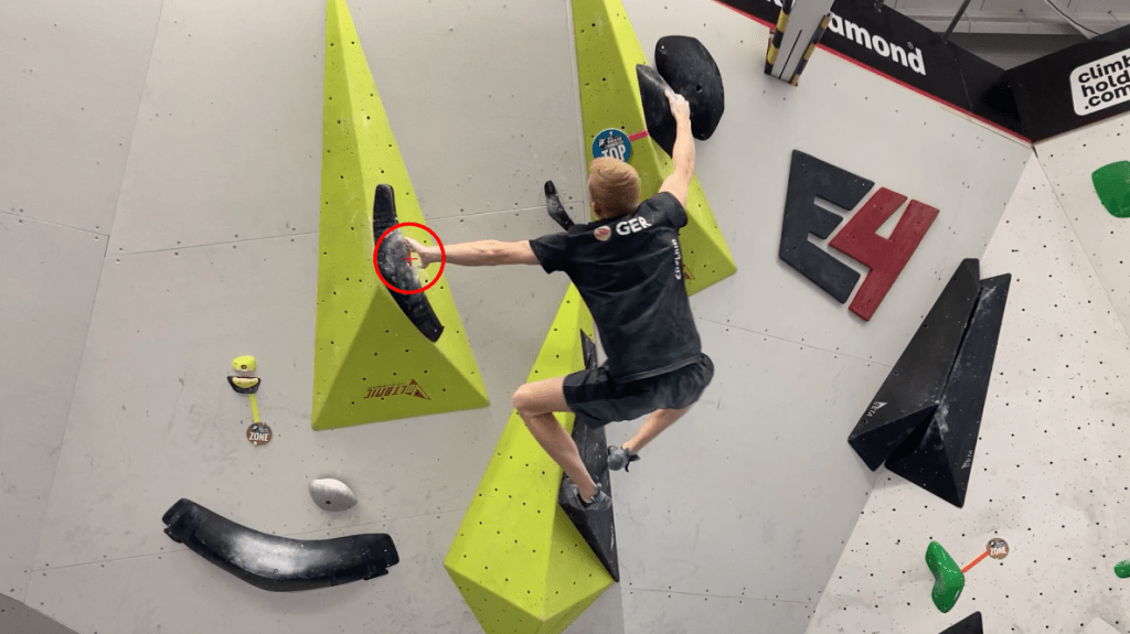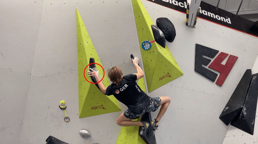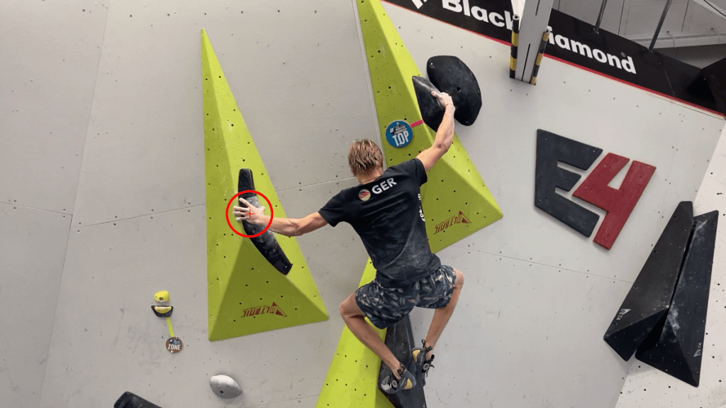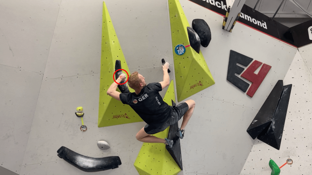 Problem solving under pressure is the most important ability in a bouldering competition. Athletes have to “read” (analyze) the problem and to anticipate possible solutions. Afterwards, they put their ideas into practical attempts. It’s always tricky to find the sweet spot between believing in a decision you’ve made and keeping a flexible mind. For beginners there is this basic search rule: “Have I discovered every hold I can climb on?” Another very important, but much more difficult rule then is: “In which ways am I able to use these holds?” Sometimes elaborate heuristics reach their limits even in elite athletes. This is the time to re-“open the search stop rule door” again: additional tactile or kinesthetic information maybe helps to form a new “rule” for finally solving the problem.