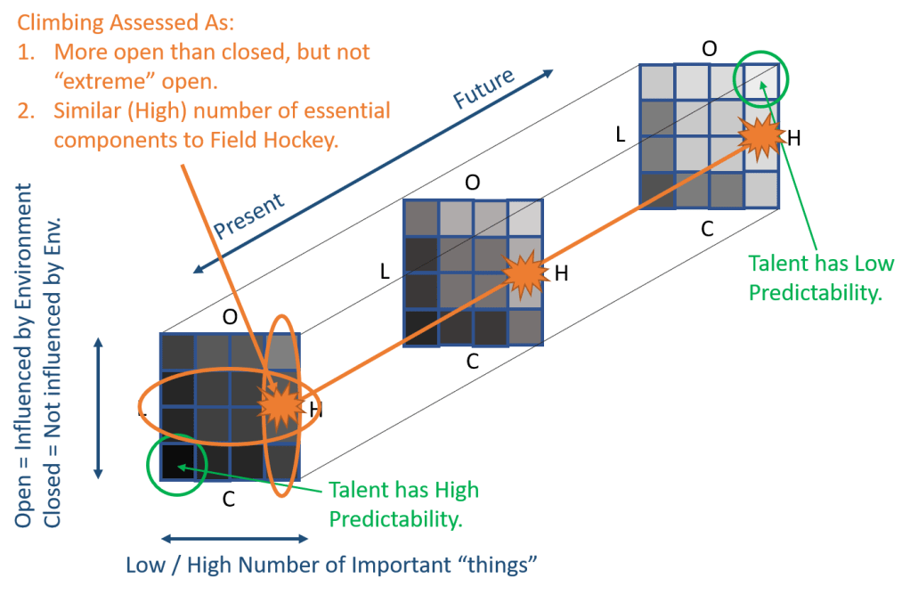 Vaeyens et al. (2008) give rowing as an example of a sport with few essential things and relatively closed to the environment, while field hockey is given as an example of a sport with many potential important things and influenced by human interaction and the environment.[ii] So what might climbing look like?[iii]