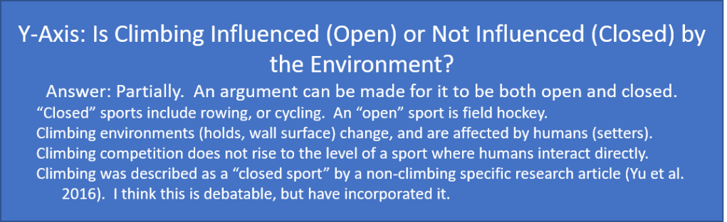 - The Y-axis of each “large” square represents the extent to which our sport is influenced by its environmental surroundings on a range of Open (more influenced) to Closed (less influenced).