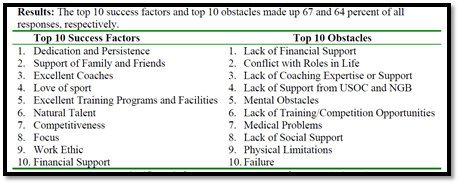 The Top-10 Success Factors and Obstacles to Olympic Success are provided in the table below. The top 3 success factors were all at or over 50% across responders, whereas only the top obstacle was. It appears as if there is more individualization in obstacles than successes.